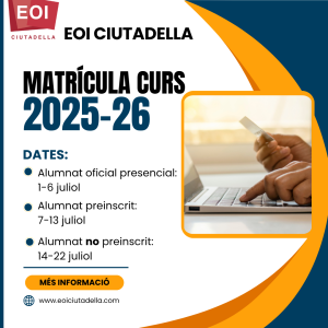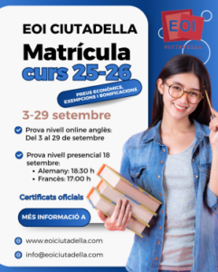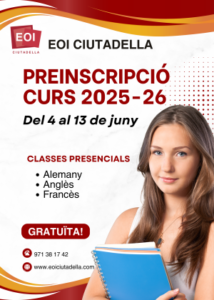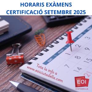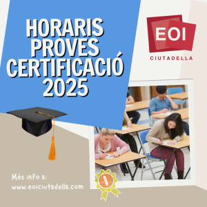 20 maig, 2025 HORARIS EXÀMENS CERTIFICACIÓ MAIG-JUNY 2025 Aquí podràs consultar els horaris de les proves de certificació escrites i orals d’ALEMANY, ANGLÈS i FRANCÈS, per a la convocatòria ORDINÀRIA de 2025. També hi trobaràs les dates de publicació de notes i revisió d’exàmens (Alumnat lliure i EOIES heu de fer sol·licitud per revisió). ATENCIÓ ALUMNAT EOIES: L’examen de certificació de B1 es durà a terme a l’EOI CIUTADELLA En aquest enllaç podràs […]