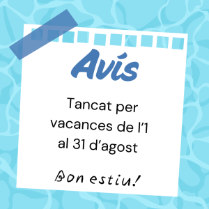 31 juliol, 2025 TANQUEM PER VACANCES D’ESTIU / MATRÍCULA SETEMBRE Tanquem per vacances d’estiu de dia 1 a dia 31 d’agost, ambdós inclosos. Tornarem a la feina dia 1 de setembre. Aquí teniu l’horari d’atenció al públic. Us recordem que les dates dels exàmens de la convocatòria extraordinària estan publicades més avall. Les classes començaran dia 29 de setembre pels grups de dilluns i dimecres i dia […]